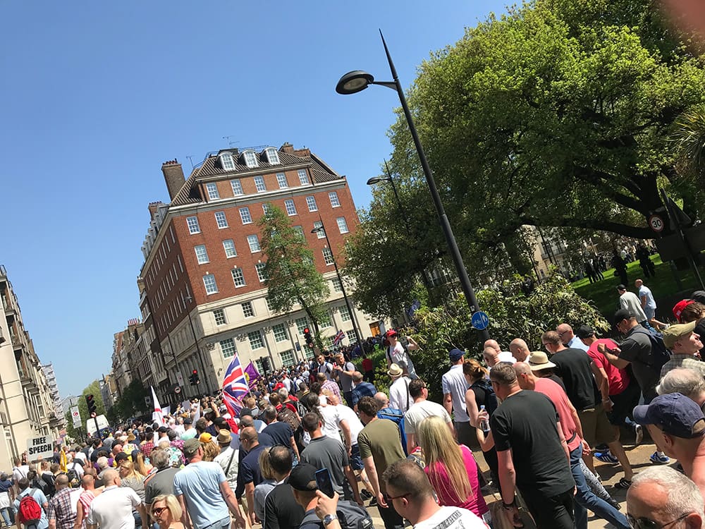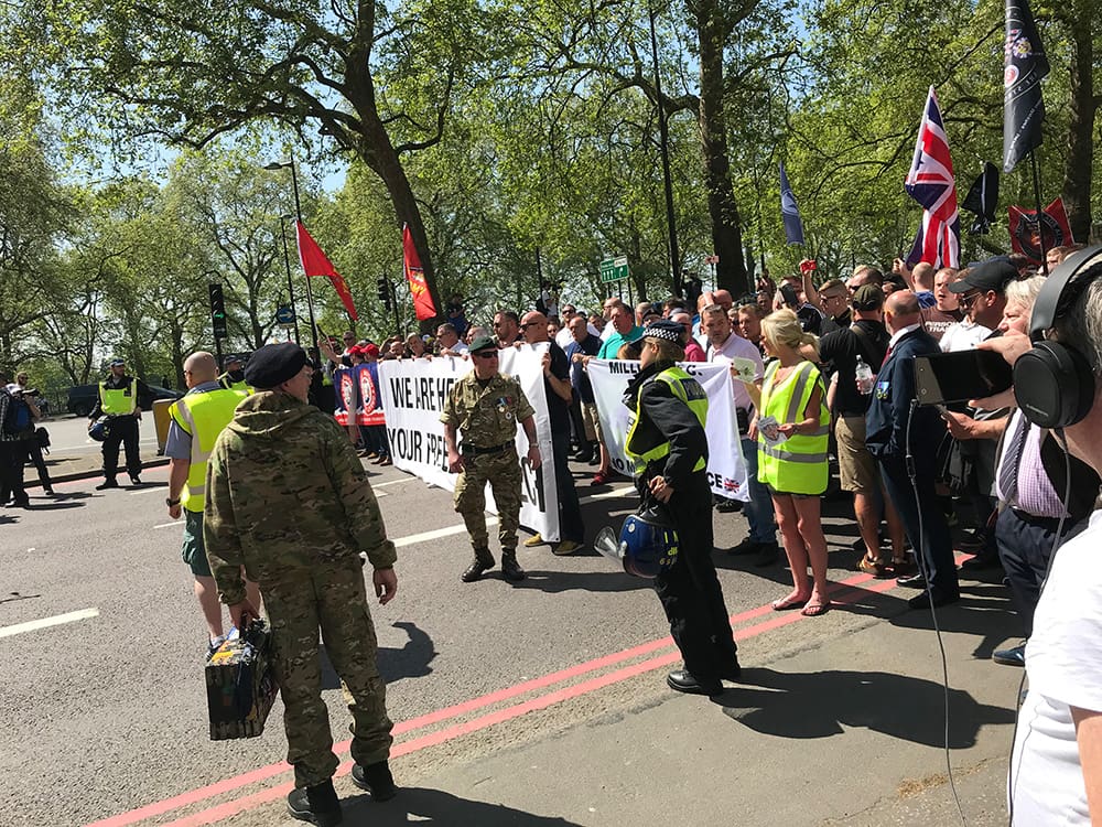 More than 5,000 took part all told, with up to 3,000 joining a feeder march organised by the Democratic Football Lads Alliance (DFLA) from Speaker’s Corner to the rally staged by “Tommy Robinson” (real name Stephen Yaxley-Lennon) in Whitehall.