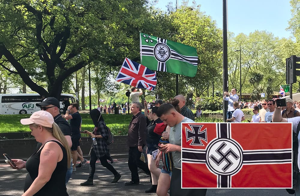 Marching happily alongside the “football lads” were supporters of the White Pendragons, Generation Identity (with a prominent flag), EDL members and other fascist grouplets. A flag of “Kekistan” – a fake country that is a regular motif on the international far right – was also visible. It is based on the Nazi war flag of Hitler’s Germany (see photo).