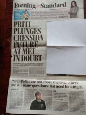 The printed edition of The Evening Standard on Friday 12th February 2021 carried the above headline stating that ‘Patel refuses to say she has confidence in police boss over botched sex enquiry. The Evening Standard article on the website was quickly updated with the headline ‘Met chief Cressida Dick publicly backed by Priti Patel and Boris Johnson over bungled VIP child abuse inquiry’ as Boris Johnson issued a statement that he and Patel did have confidence in Cressida Dick. Compare the article in the printed edition with the updated article on the Evening Standard website here
