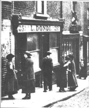 Dondi’s stood at number 24/25A Eyre Street Hill in the heart of Clerkenwell’s Little Italy and was described as a bowling club run by a family of Italians. Most of that part of the district has vanished, but this building remains miraculously intact. Today, it has the name of Gunmakers, a pub that retains a rear section where customers would once play the game of bowls. This must have made the Italian descendants from families who had gravitated to that area since the 1850s feel at home.