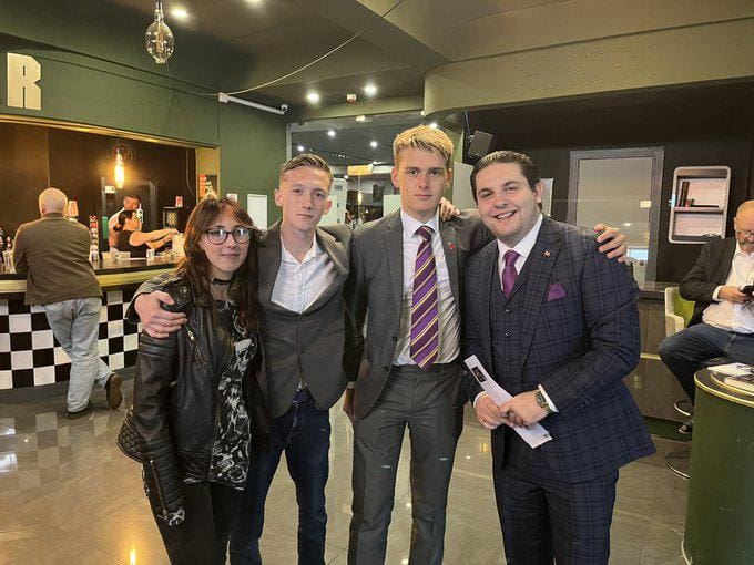 UKIP youth wing: almost the entire membership of Students Against Tyranny (sic) including (far left) Sydney Jones, speaker and Tommy Robinson chum, James Harvey, Christopher Cousins and Jack Thomson