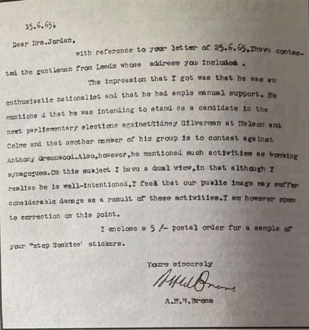 As Searchlight has reported on other occasions, Andrew Brons, BD’s Deputy Chairman and one of its founders, wrote this in a letter to National Socialist Movement leader Colin Jordan’s wife, Francoise Dior.