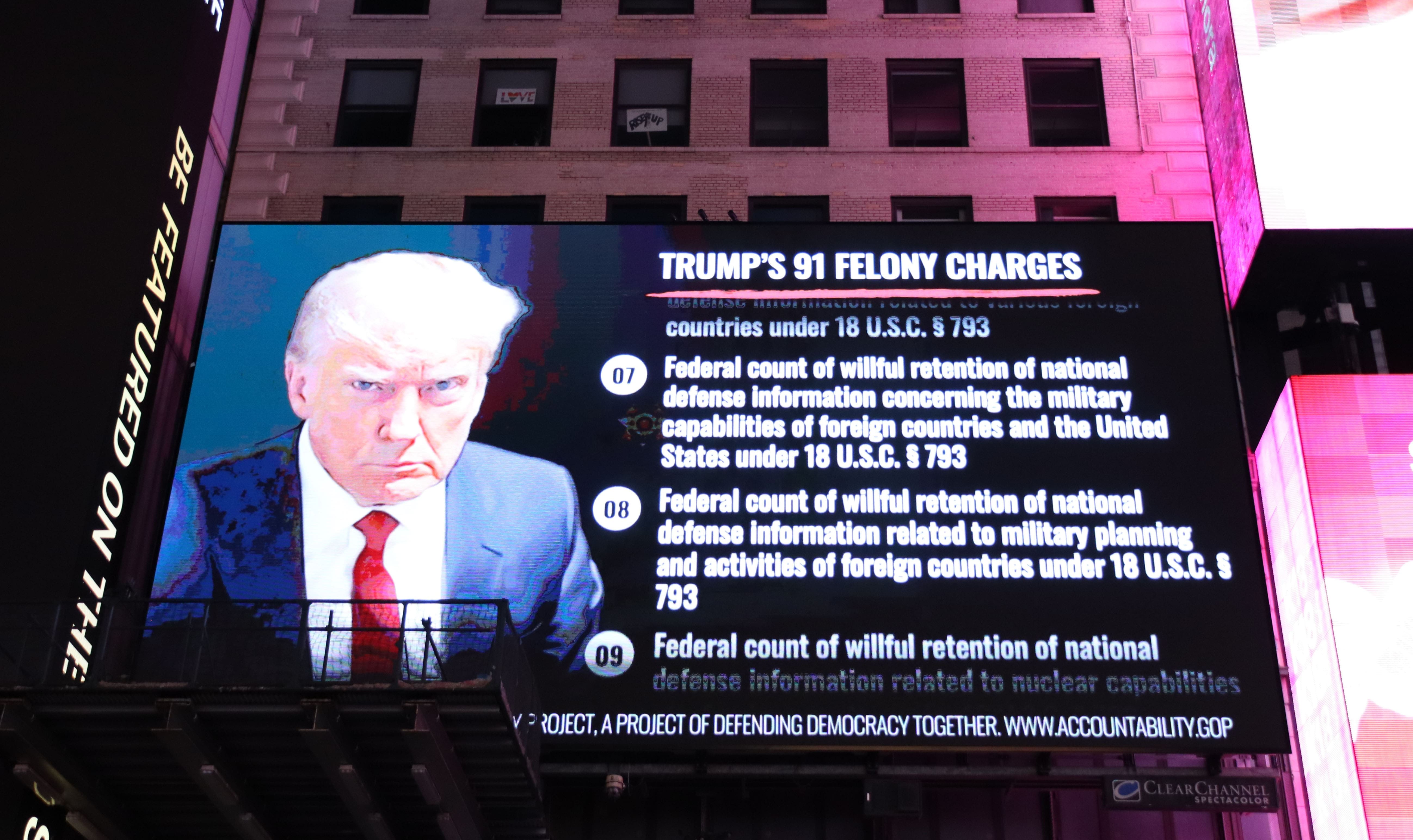 Lawbreaker A billboard in Times Square, New York, scrolling through the list of Trump’s felony charges. It was displayed in September as part of the Republican Accountability Project campaign to highlight Trump’s contempt for the law Pic credit Elvert Barnes Photography