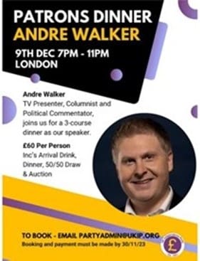 Further afield, preparations are in hand for UKIP’s upcoming Patrons’ Dinner in London on 9 December, where the guest speaker is none other than Talk TV right wing gobshite Andre Walker.