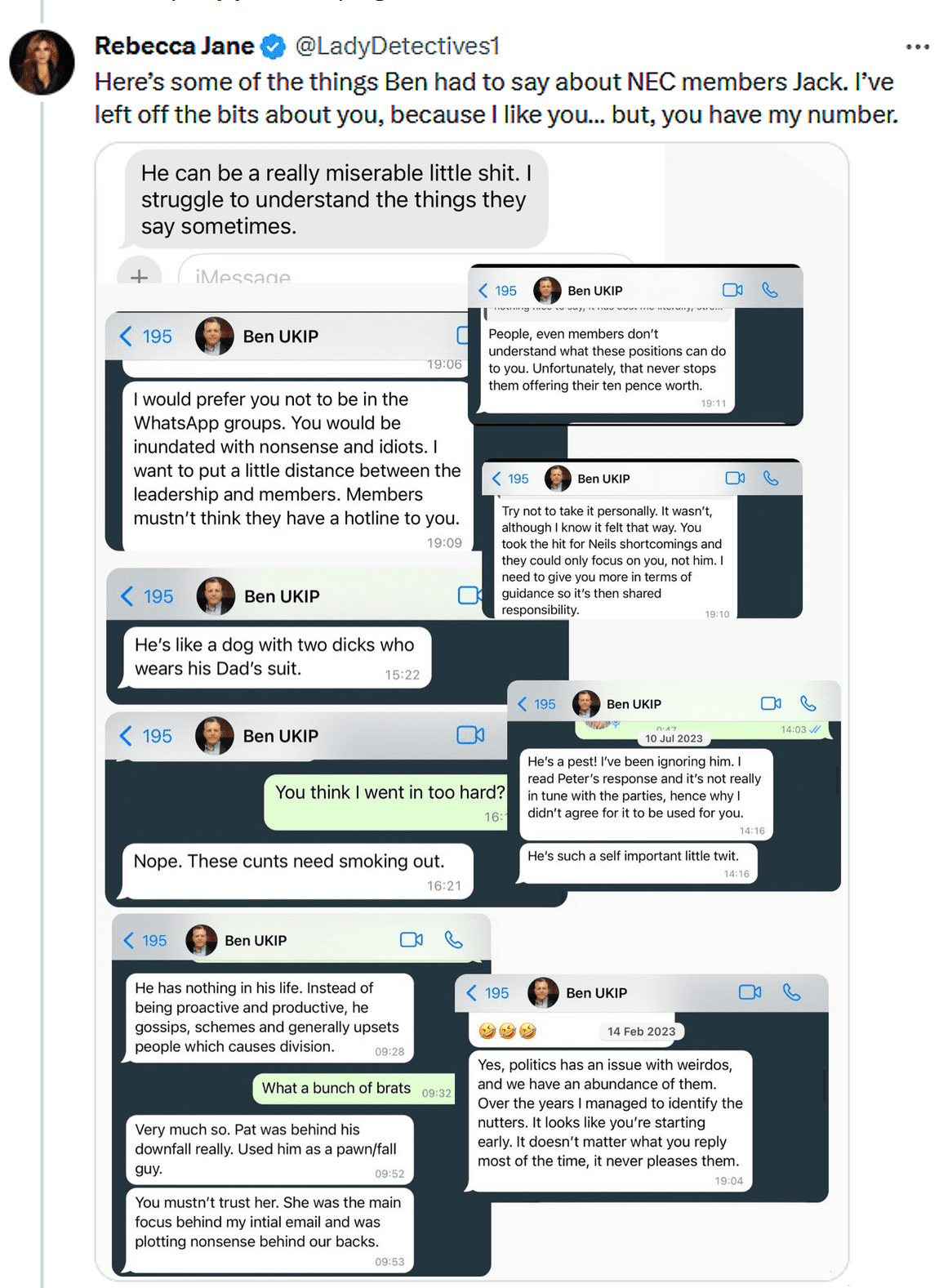 UKIP’s internal feud has just become even dirtier with Rebecca Jane, recently resigned Deputy Leader, pouring petrol on the fires by posting these private messages between her and Chairman Ben Walker where he slagged off leading members of the party’s NEC.