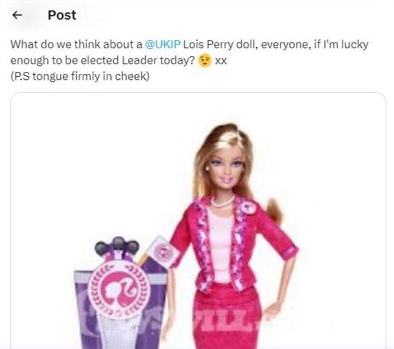Politically, Perry’s election will almost certainly herald UKIP disappearing further and faster down the conspiracy rabbit hole. Whereas Etheridge was an old school anti-immigration, anti-Europe traditionalist, Perry is right up there with the climate-denying, anti-ULEZ, anti-15-minute cities, anti-net zero conspiracy-obsessed nut jobs. Up till now she’s been running the pro-car lobby group Car26 and has said she’s not that bothered by immigration. In a previous incarnation she was the SE Representative of Laurence Fox’s Reclaim Party and appears regularly on GB News. She also claimed that she “had a moment” with Boris Johnson; “something could have happened, but it didn’t…”