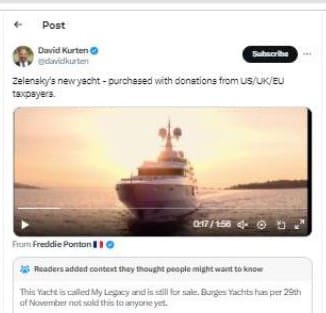 Kurten has been in trouble a few times when he was caught posting disinformation online. Last November he posted film of a luxury yacht which he claimed had been purchased by Ukrainian President Zelensky with funds from the UK, USA and EU (pictured). It turned out the yacht had not been bought by anyone – it was still listed for sale. In fact, it is still listed for sale today.