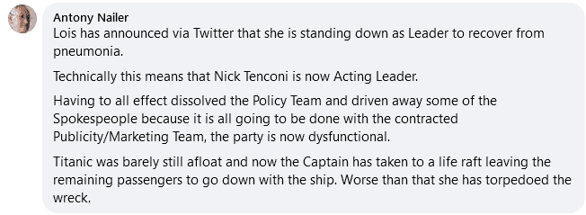 Clearly suspecting that Perry is off to join Farage in Reform UK, Antony Nailer, UKIP’s Treasury, Energy, Transport & Environment spokesperson has fired off a bitter salvo in her direction, accusing her of deserting a sinking ship: