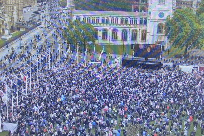 It seems that the numbers in Parliament Square thinned out considerably during the screening of the ‘Lawfare’ documentary on a screen that must have cost Robinson a fair bit to hire.
