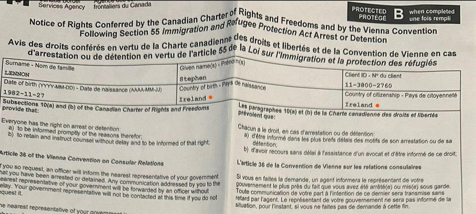 Far from keeping this quiet, Lennon posted online a photograph of a Canada Border Services Agency (CBSA) notice of rights issued to him as someone arrested or detained by the agency.