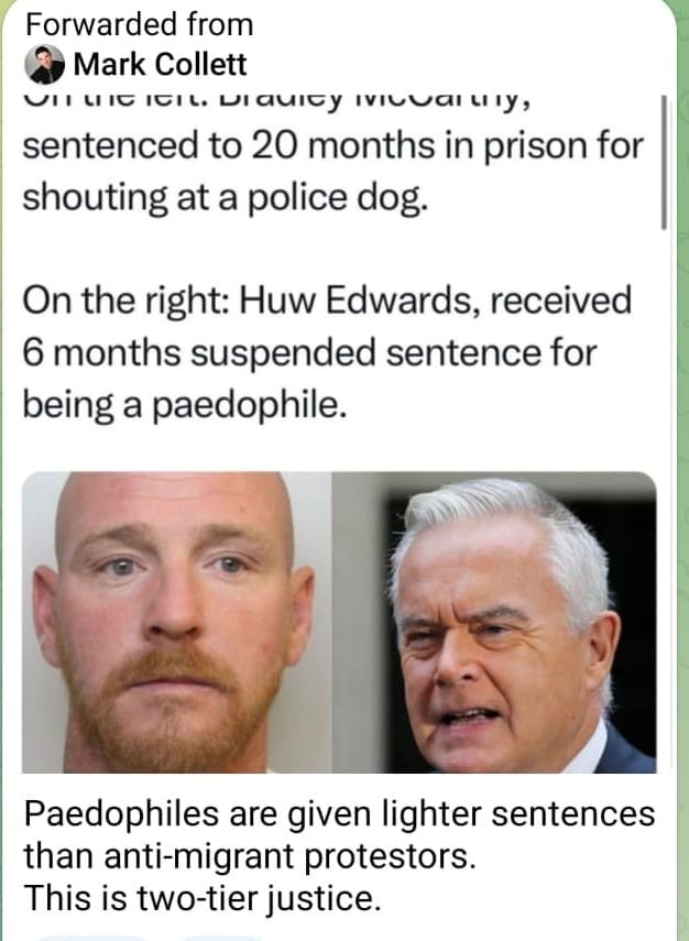 No one will want to speak in defence of Huw Edwards, who is a disgrace, but that doesn’t excuse Collett misrepresenting his counter-example as a man who simply shouted at a dog when, according to police, McCarthy “played a key role in encouraging shocking abuse towards police officers and members of the public and the wider violent disorder…”