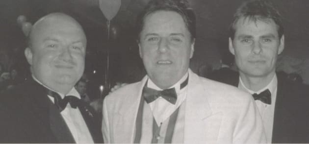 Searchlight mole Andy Sykes (left) and undercover BBC reporter Jason Gwynne (right) with BNP leader Nick Griffin (centre), at a dinner hosted by the party in 2004 for France’s then fascist leader Jean-Marie Le Pen