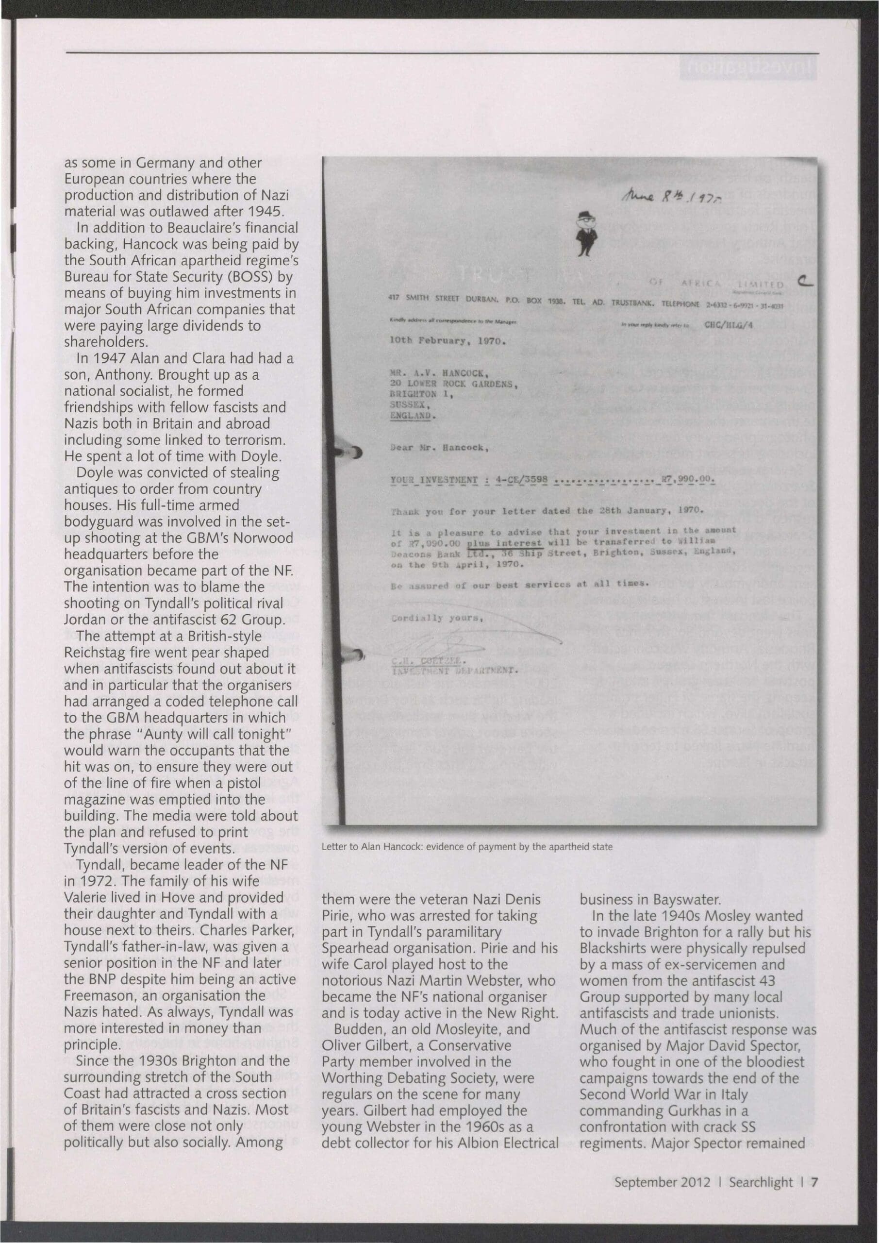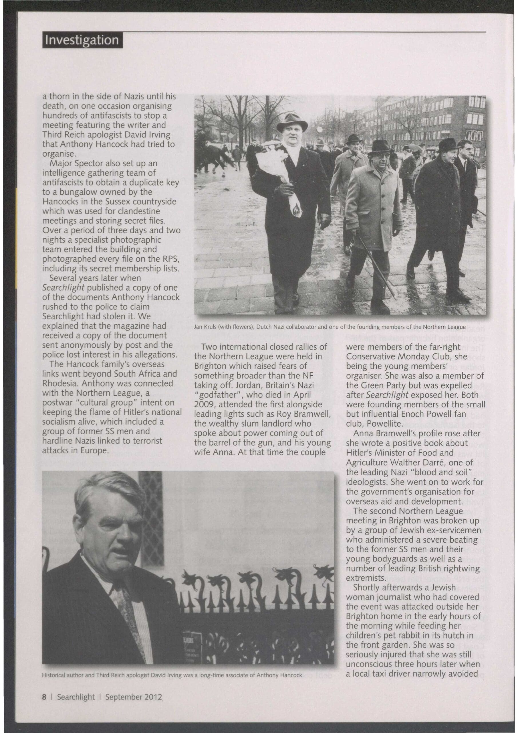 After an international Northern league meeting in Brighton in 1971 was broken up by the anti-fascist 62 Group it was Hancock who arranged for a local Jewish Chronicle journalist to be savagely beaten and left unconscious in the street in revenge.