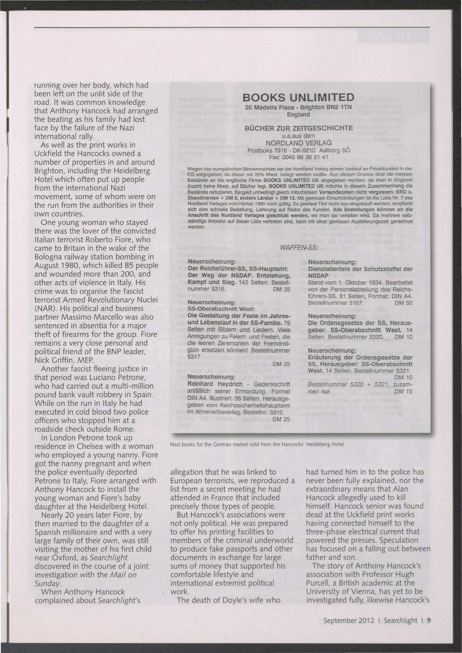 Hancock’s international connections put him at the heart of some of the most evil nazi organisations operating at the time. He was the main UK contact for the neo-Nazi terrorists and fascists who plagued Europe with bomb attacks and other violent outrages in the early 1980s. It was at his Heidelburg Hotel in Brighton that Ray Hill, there as Hancock’s guest, was originally introduced to the French neo-Nazi terrorist who would in turn introduce him to the French nazis behind the plot to bomb the Notting Hill Carnival in 1981.