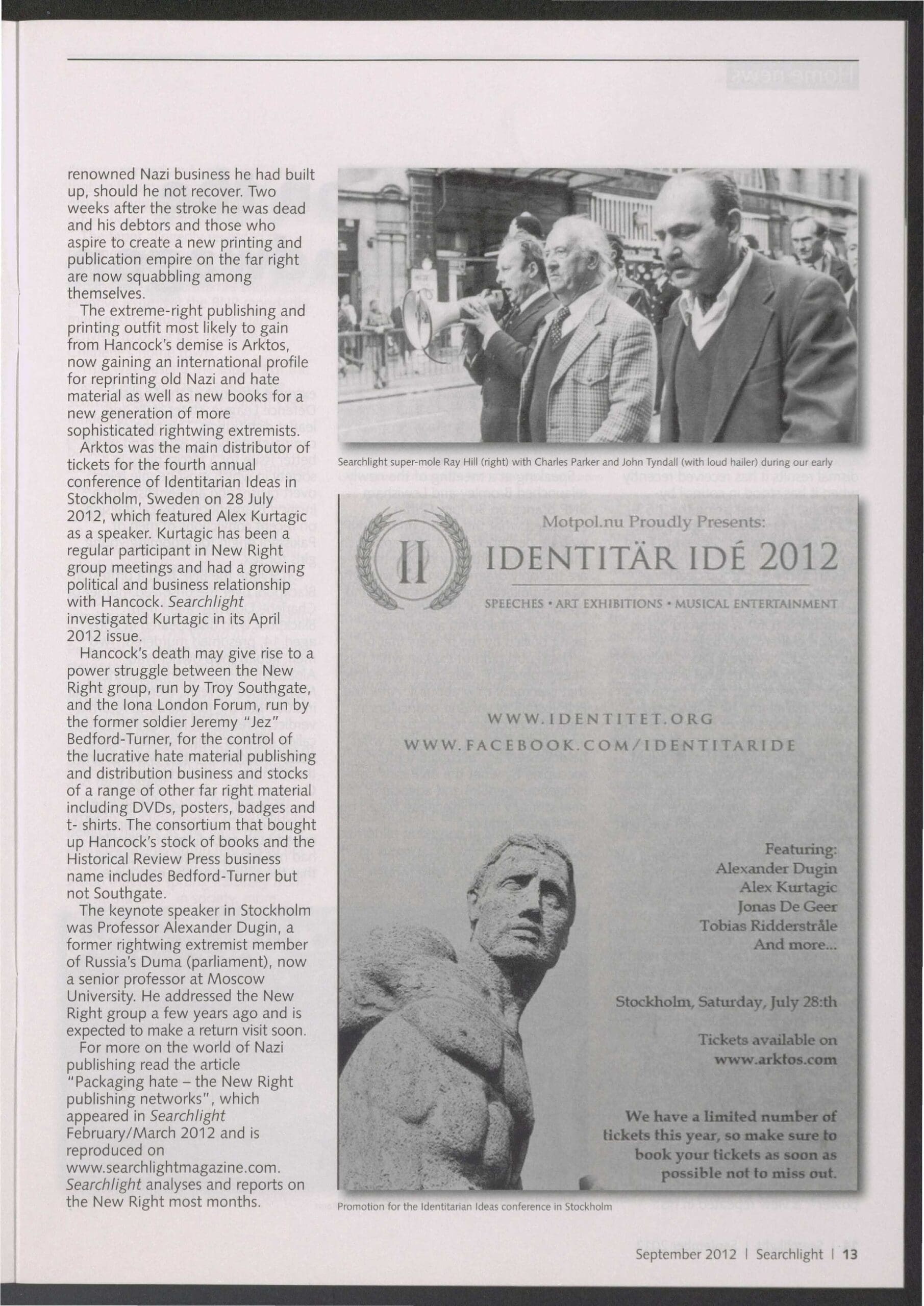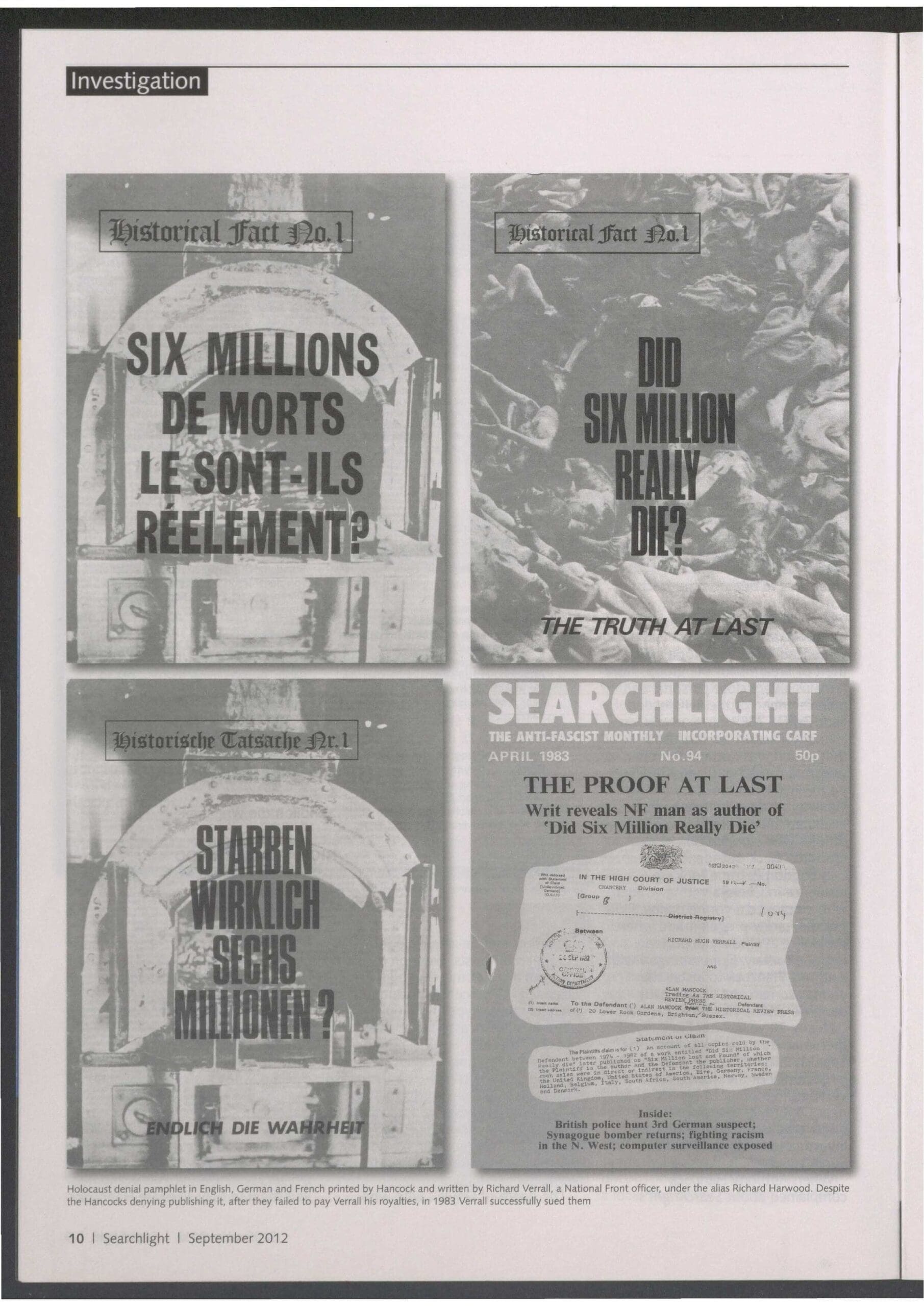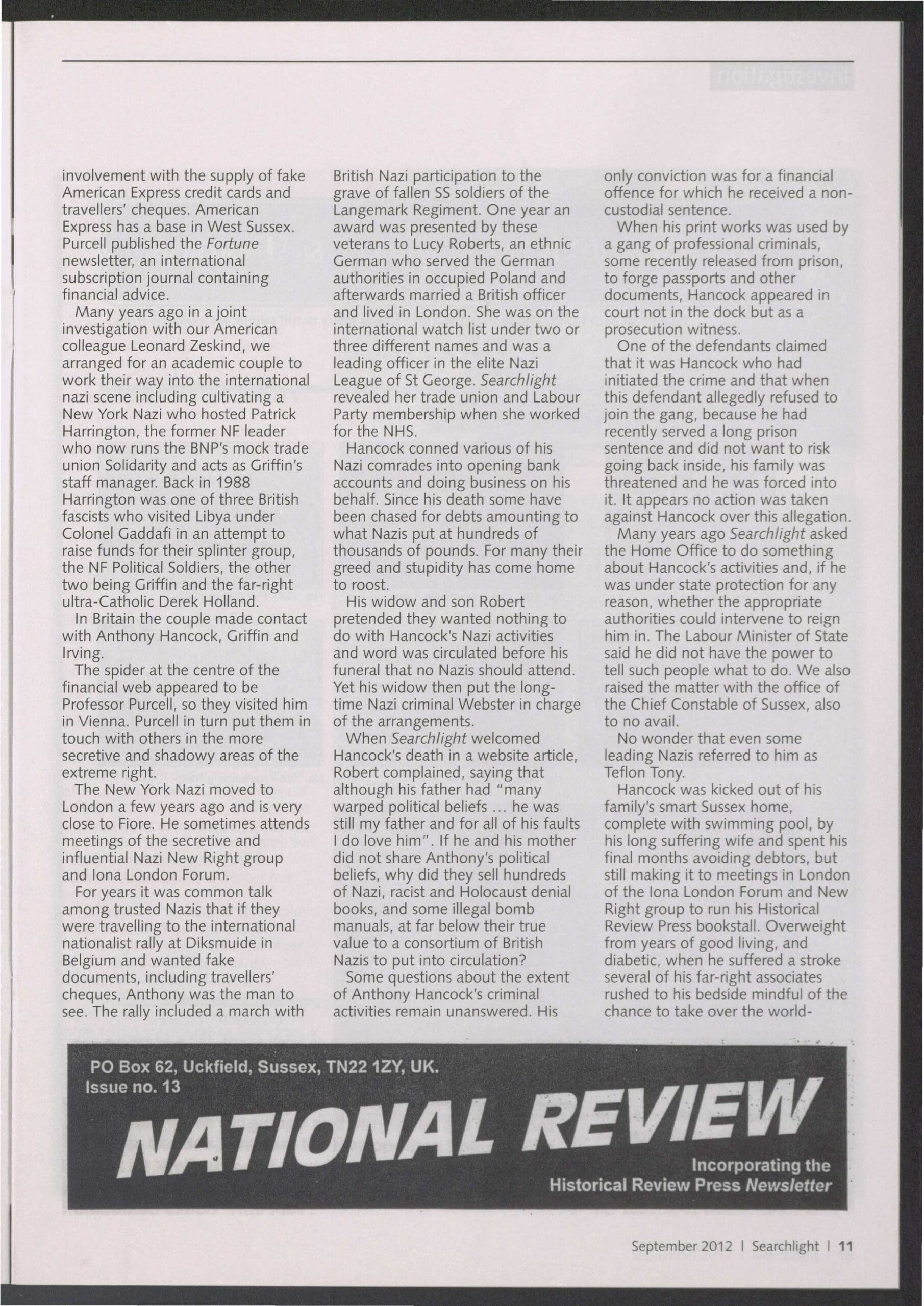 Anthony Sandford Hancock (pictured, top left) was a lifelong neo-Nazi, antisemite, racist and holocaust revisionist. He and his father, Alan Hancock, ran a printing press in Uckfield, Sussex, which acted as printer to the fascist and neo-Nazi movement worldwide. It flooded the globe with some of the most vile nazi propaganda imaginable. Most notably, the notorious ‘Did 6 Million Really Die’ by ‘Richard Harwood?’ (aka Richard Verrall of the National Front) poured off Hancock’s presses in print runs of tens of thousands and in many languages to be distributed worldwide.
