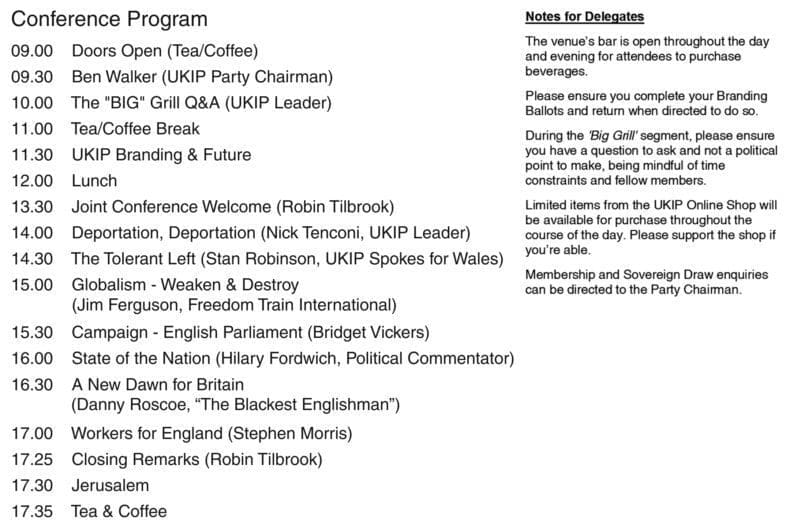 Oh, and a note to the hapless party Chairman and conference organiser Ben ‘Rogue Builder’ Walker: spelling it ‘program’, unless in a computing context, is really a pretty obvious Americanism and not a great look for a patriotic UK party such as yours. Talking of Walker, we are wondering why some conference-goers are referring to him – sotto voce – as ‘Bent Walker’.