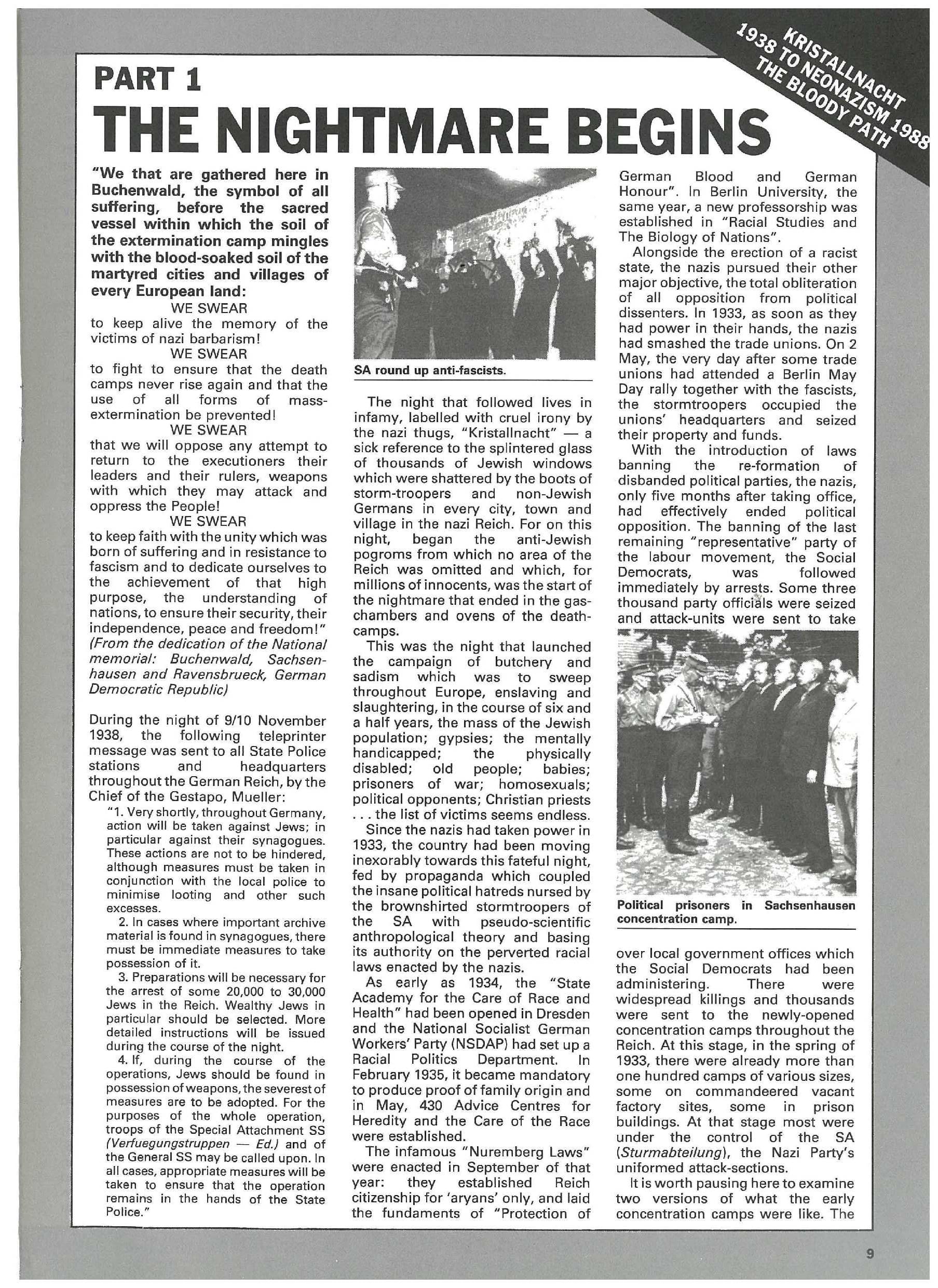 To mark the anniversary of the 1938 November Pogrom, otherwise known as Kristallnacht, we reprint a special article published by Searchlight in 1988, 50 years after the dreadful events which portended the Holocaust.