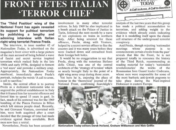 One of its most prominent members, initially convicted of participation in the attack, was Franco Freda (above) who was lauded in the UK National Front’s ‘Nationalism Today’ in 1988 after he had been acquitted on appeal, a link exposed in Searchlight (below). Then, the NF was under the control of the ‘Political Soldier’ faction which looked to Italian terrorists like Roberto Fiore for inspiration.