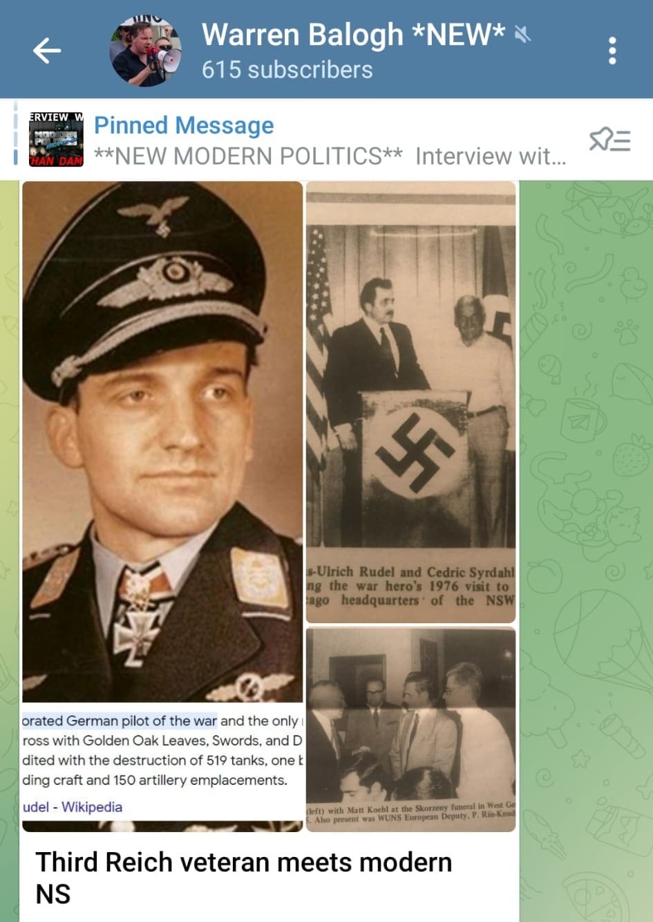 And only yesterday, as Collett tore into Smith, Balogh was online waxing lyrical about how his father’s political mentor, ‘Commander’ Matt Koehl, inheritor of Lincoln Rockwell’s American Nazi Party from August 1967, met up with nazi pilot and Hitler apologist Hans Ulrich Rudel in the 1970s. How Warren wished he’d been there with his dad, Alan, a notorious hatemonger in US extremist circles.