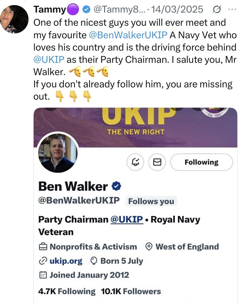 A UKIP admirer (and boy does she admire him!) who appears on X (Twitter) as @Tammy8762535565, posted recently her passionate belief that Ben is some kind on patriotic superhero: