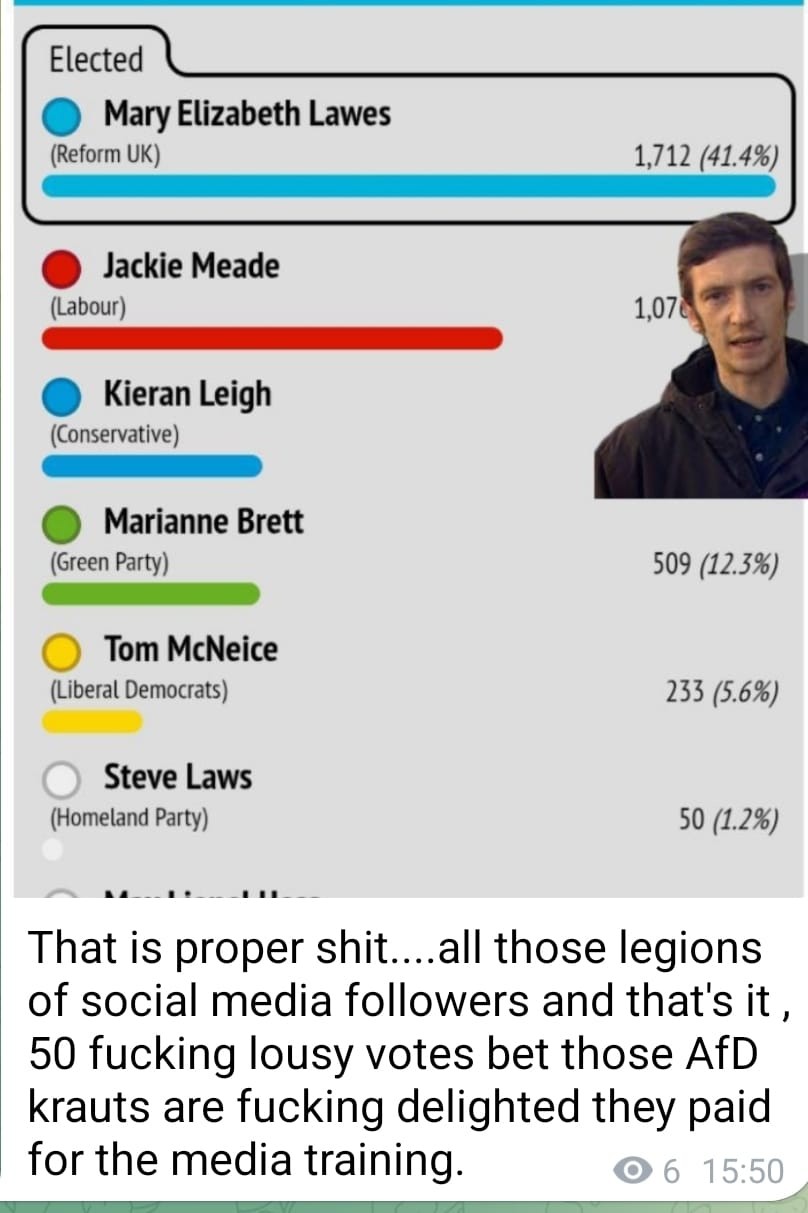 Timothy Knowles polled only 18 votes (0.6%) in a Derbyshire County council division near Heanor. Perhaps voters there are unimpressed by the once frequent use of their area as a location for nazi skinhead gatherings.