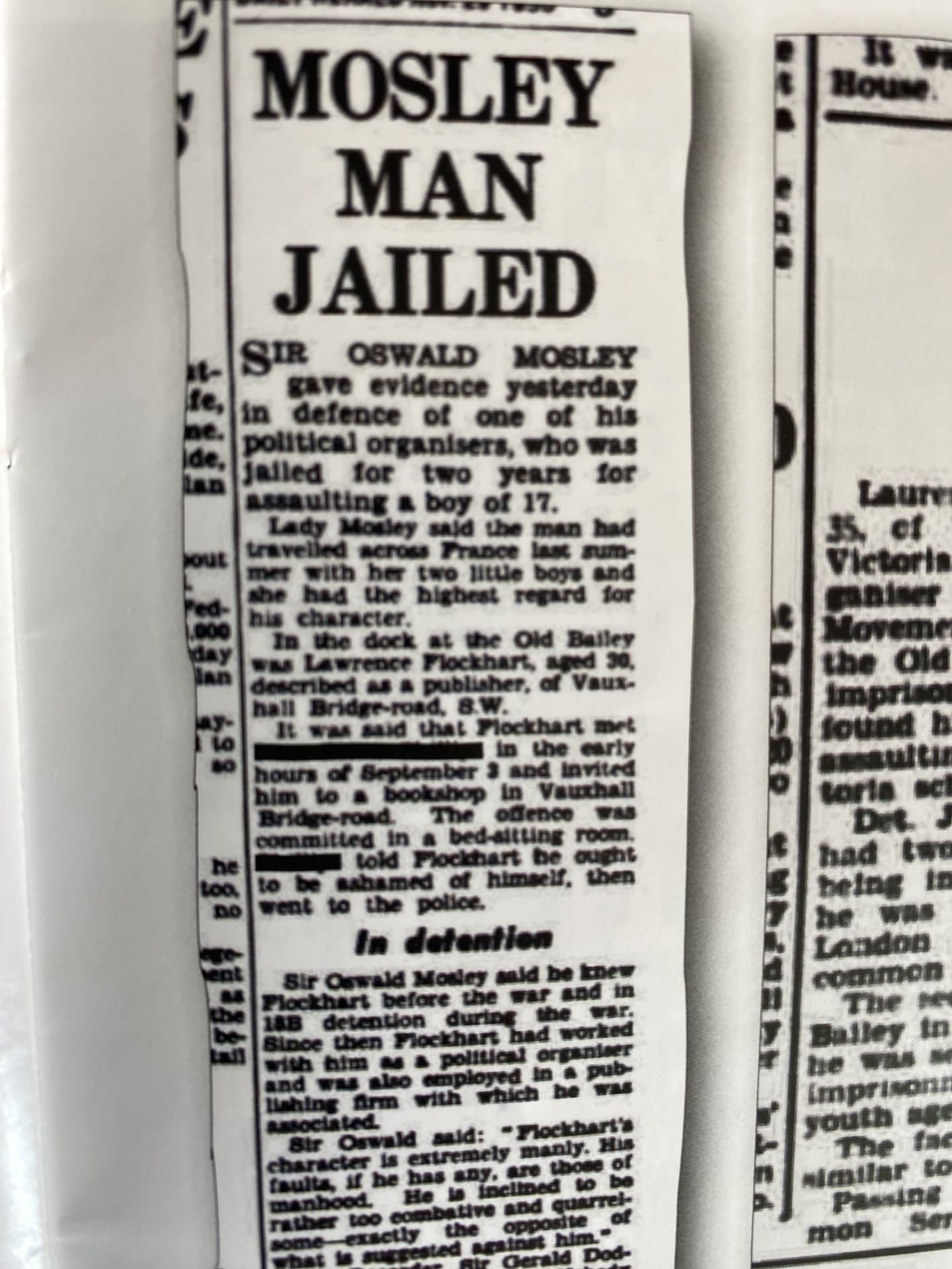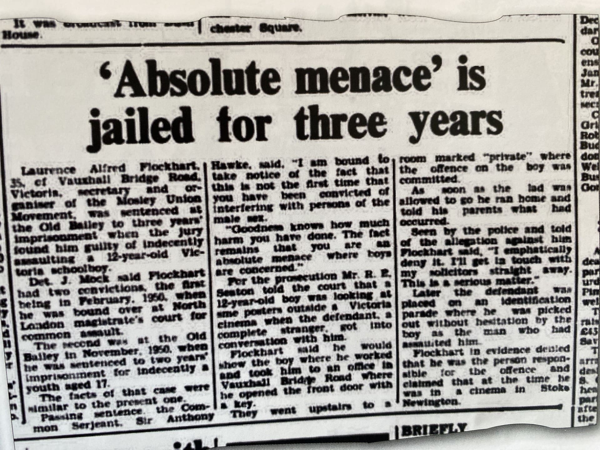 In the 1950s he was jailed, twice, for offences against young boys. Both were assaulted in Union Movement headquarters, where Flockhart lived in an upstairs flat. The youngest was only 12 years old. Mosley, loyal to his man, ignored the first conviction but had to act after the second, and Flockhart was expelled from UM. For a while.