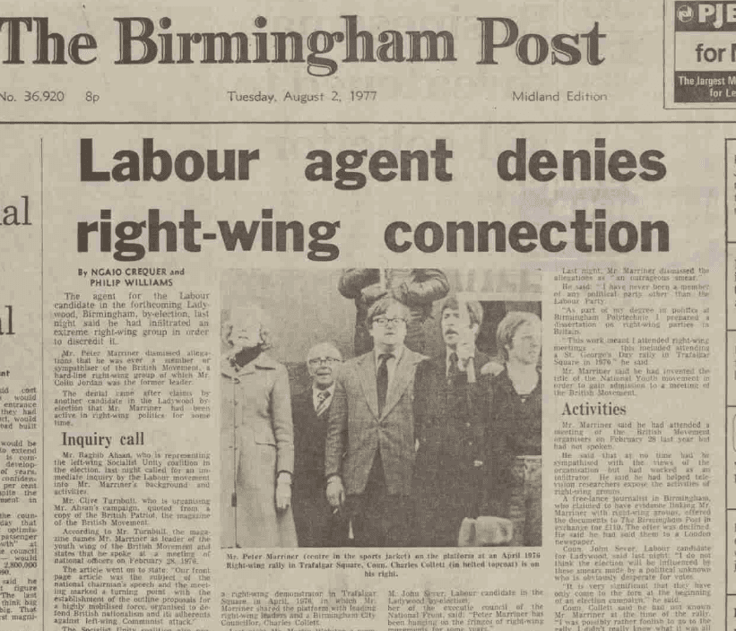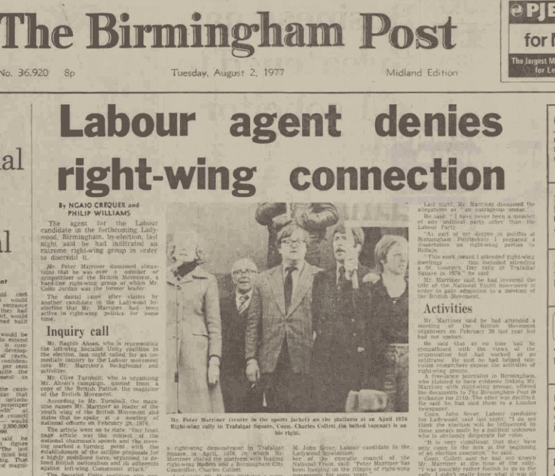 The next issue of Searchlight carried a three-page article entitled ‘Peter Marriner – Labour’s fascist infiltrator’, which purported to expose Peter as a true nazi for many years who had been trying to infiltrate the Labour Party and other left-wing groups.