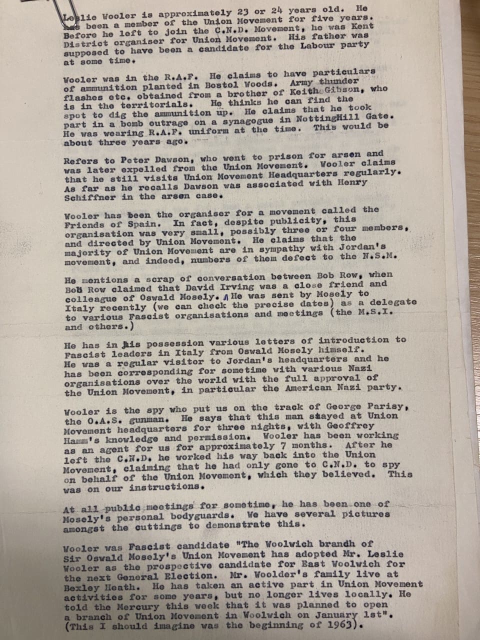 The man he was meeting – for the first time – had come forward with an offer to work undercover for the 62 Group. His name was Les Wooler and he was to become one of Searchlight’s most enterprising and successful informants operating over many years.