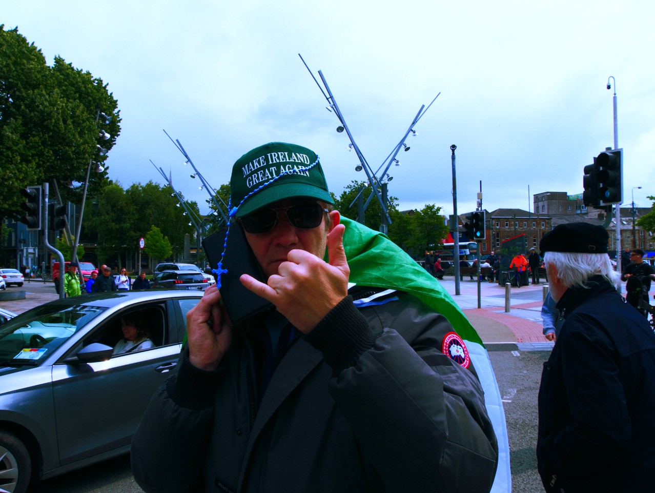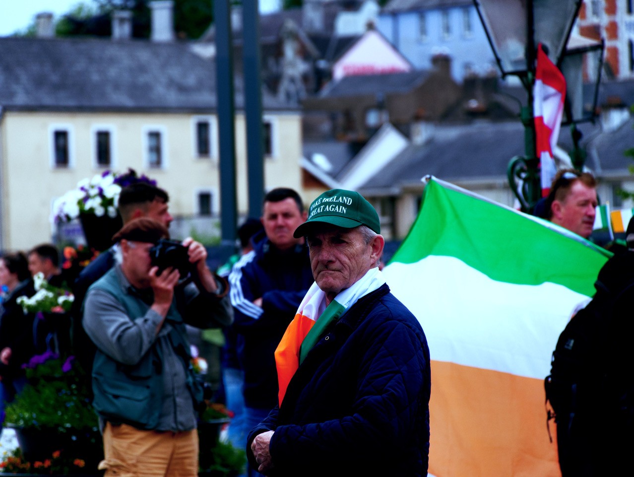Curiously, whilst marching to city hall Blighe was pictured walking alongside a Tricolour with the infamous QAnon slogan, WWG1WGA (Where we go one we go all). Alongside the plethora of Make Ireland Great Again hats on display, the Irish far-right ironically continues to rely on imported ideas.