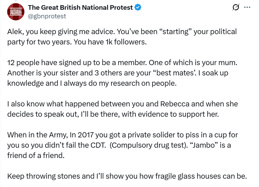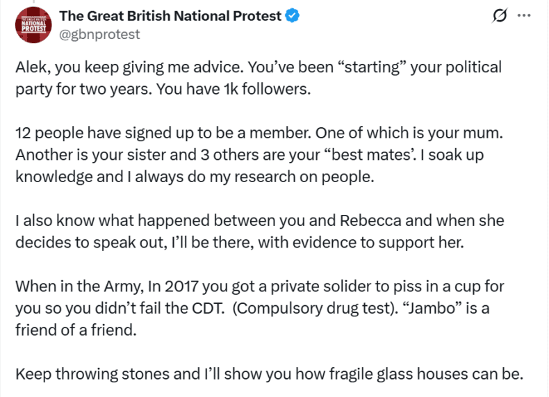 His most recent target is Richard Donaldson, another ex-soldier and organiser of the upcoming Great British National Protest in Dover who, Yerbury loses no opportunity to point out, is constantly appealing for money for a legal action by Dover Council that hasn’t even materialised.