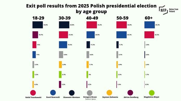 According to the exit poll conducted during the first round, among voters aged 18 to 29, the Konfederacja party came first, with 34.8% of the vote, while Adrian Zandberg of the left-wing Together (Razem) party was second, with 18.7%.