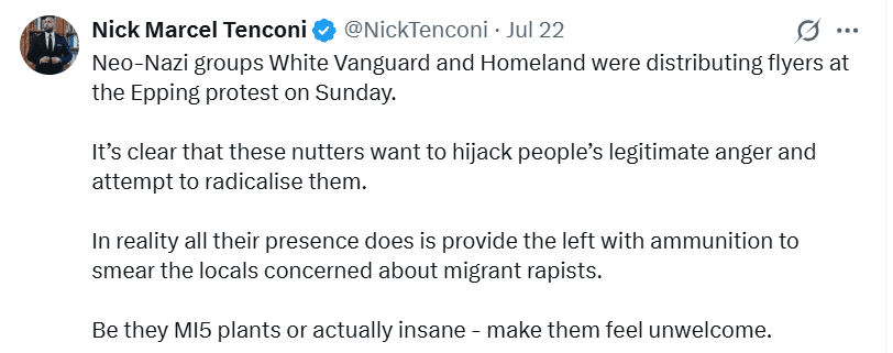 This sent not only Nick Tenconi but also ‘Tommy Robinson’ into minor fits of apoplexy. Tenconi had already railed against nazis from Homeland and White Vanguard pitching up in Epping: