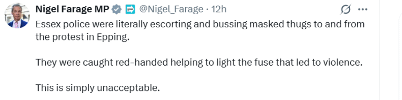 “Essex police were literally escorting and bussing masked thugs to and from the protest in Epping.