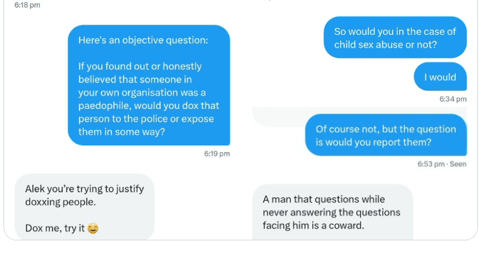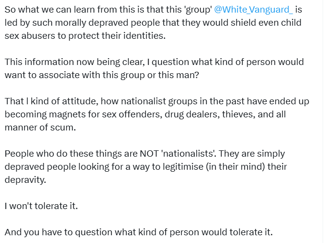 So, the question he put to White Vanguard was whether they would report a comrade who they knew, or had good grounds to believe, was a paedophile.