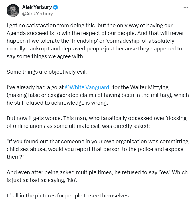 The row was further cranked up when Yerbury challenged White Vanguard on an issue he has ventilated before, particularly in relation to Mark Collett and Patriotic Alternative: the tendency on the far right to forgive almost anything if the culprit is a nationalist. This is his post in full (sorry):