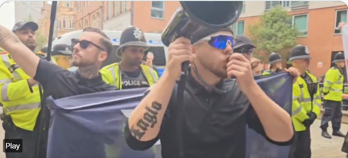 When White Vanguard turned up at Britain First’s Birmingham rally in May, and ‘Walter Mitty’, though a megaphone, delivered an antisemitic diatribe ranting that Britain needed a national socialist government and that “The Muslim jihadis are the foot soldiers of the Zionist Jews”, they were bitterly denounced by Britain First leader Paul Golding.