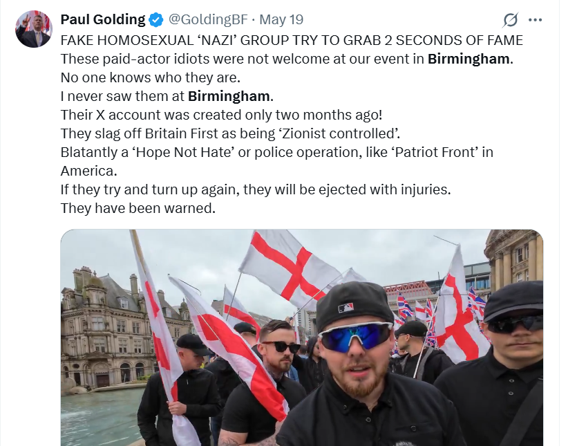 He called them a “Fake Nazi homosexual group…Blatantly a Hope Not Hate or police operation…”