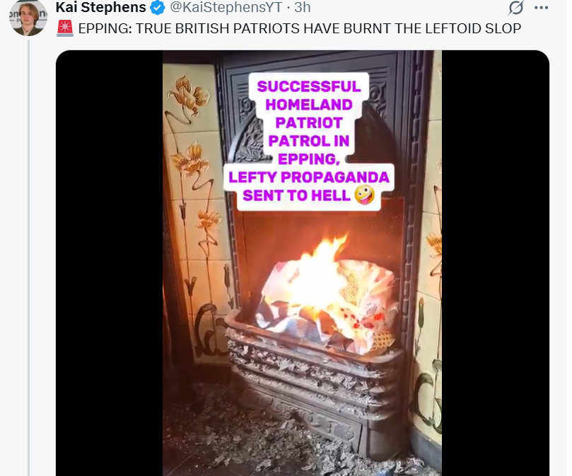 Callum Barker, the Homeland Party activist who has been central in organising the racist protests in Epping, and Kai Stephens, the party’s Norfolk organiser, posted these pictures of the banner being stolen, brandished, and then burnt.