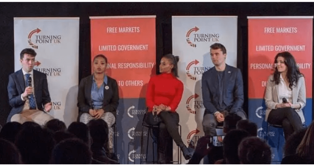 Its British offshoot, Turning Point UK, was launched in 2018 at a London event headed up by Charlie Kirk and TP USA Communications Director, Candace Owens.
