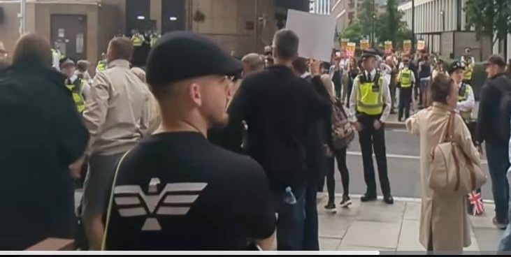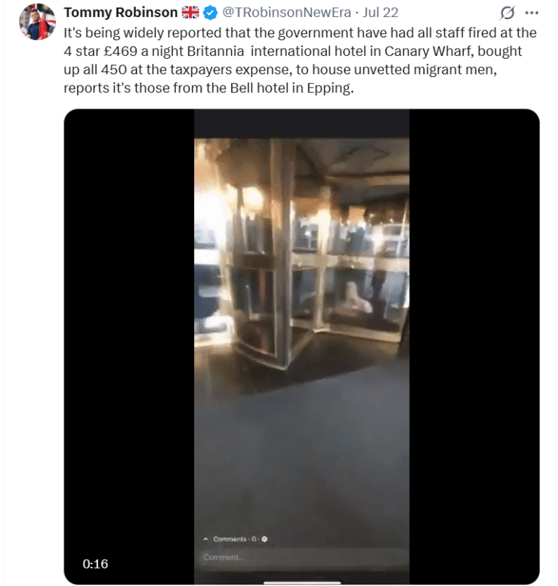 So, if you were wondering how far-right protestors turned up so suddenly yesterday at a hotel in Canary Wharf in London, said to be housing migrants, you need look no further than the inciter-in-chief, Tommy Robinson.