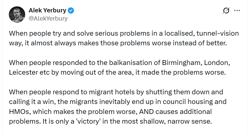 “When people respond to migrant hotels by shutting them down and calling it a win, the migrants inevitably end up in council housing and HMOs, which makes the problem worse, AND causes additional problems.