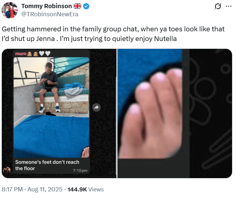 A post which Robinson himself reproduced from their ‘family group chat’ suggests that Jenna Vowles is also there, keeping him company.