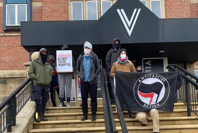 As a result there was an early counter-demonstration by local Anti-Fascist Network activists, and Stand Up To Racism issued an emergency callout which led to more joining the protest outside the hotel later in the day.
