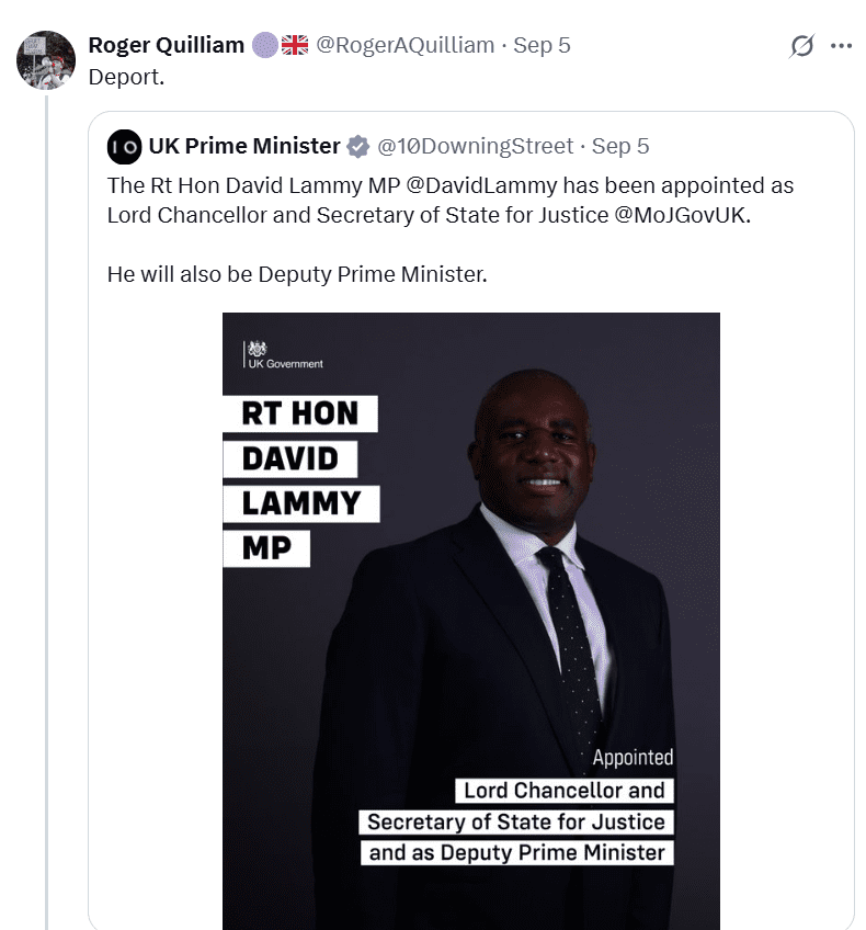 The UKIP announcement prompted friends at @WalesAtTheUN to have a look into Quilliam’s recent past and they spotted, which we missed at the time, that at the beginning of the month, when Keir Starmer rearranged his cabinet, Quilliam was calling for the deportation of David Lammy (born in London) and Shabana Mahmood (born in Birmingham).