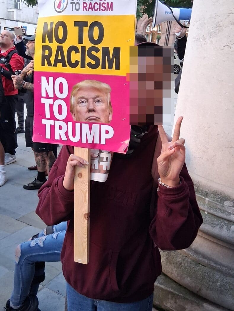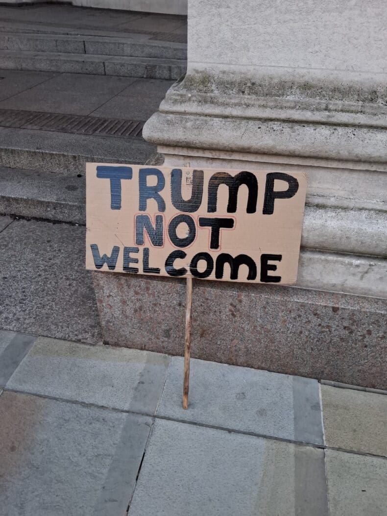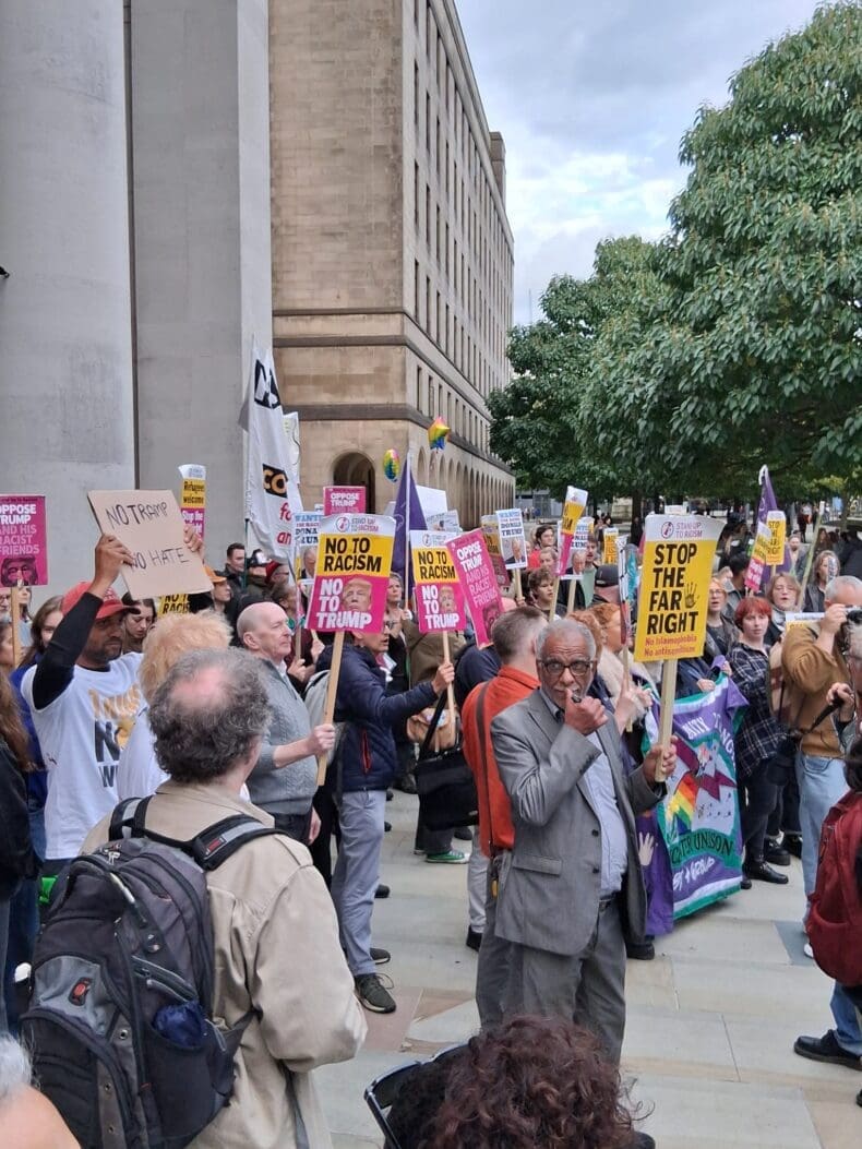 Manchester Central Library on St Peter’s Square was recently witness to the horror of 600 racists marching behind a Britain First banner, the party’s biggest event to date. Yesterday, a smaller, more local demonstration by local people concerned about Donald Trump’s current State visit gathered to protest at this famous venue.