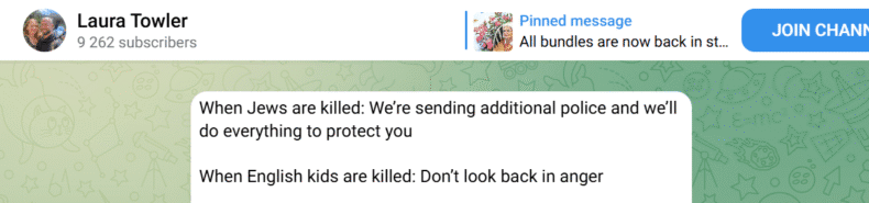 “When Jews are killed: We’re sending additional Police and we’ll do everything to protect you. When English kids are killed: Don’t look back in anger.”