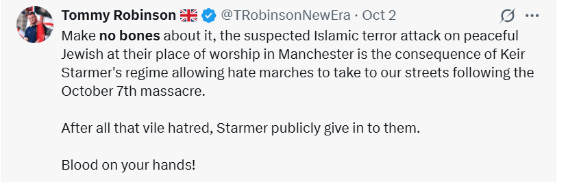 “Make no bones about it, the suspected Islamic terror attack on peaceful Jewish at their place of worship in Manchester is the consequence of Keir Starmer’s regime allowing hate marches to take to our streets following the October 7th massacre. After all that vile hatred, Starmer publicly gives in to them. Blood on your hands!”