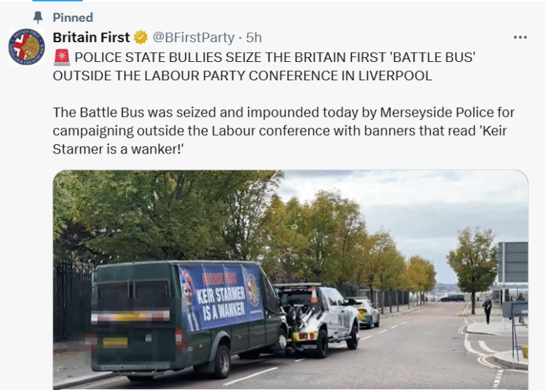 Fast forward to the Labour Party conference in Liverpool today, where Golding turned up with his bus, still bearing the offending banner, knowing full well that it would in all probability be seized.
