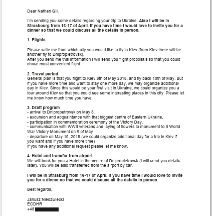 Gill’s expenses were covered by Niedźwiecki’s Brussels-registered NGO, the European Council on Democracy and Human Rights (ECDHR).