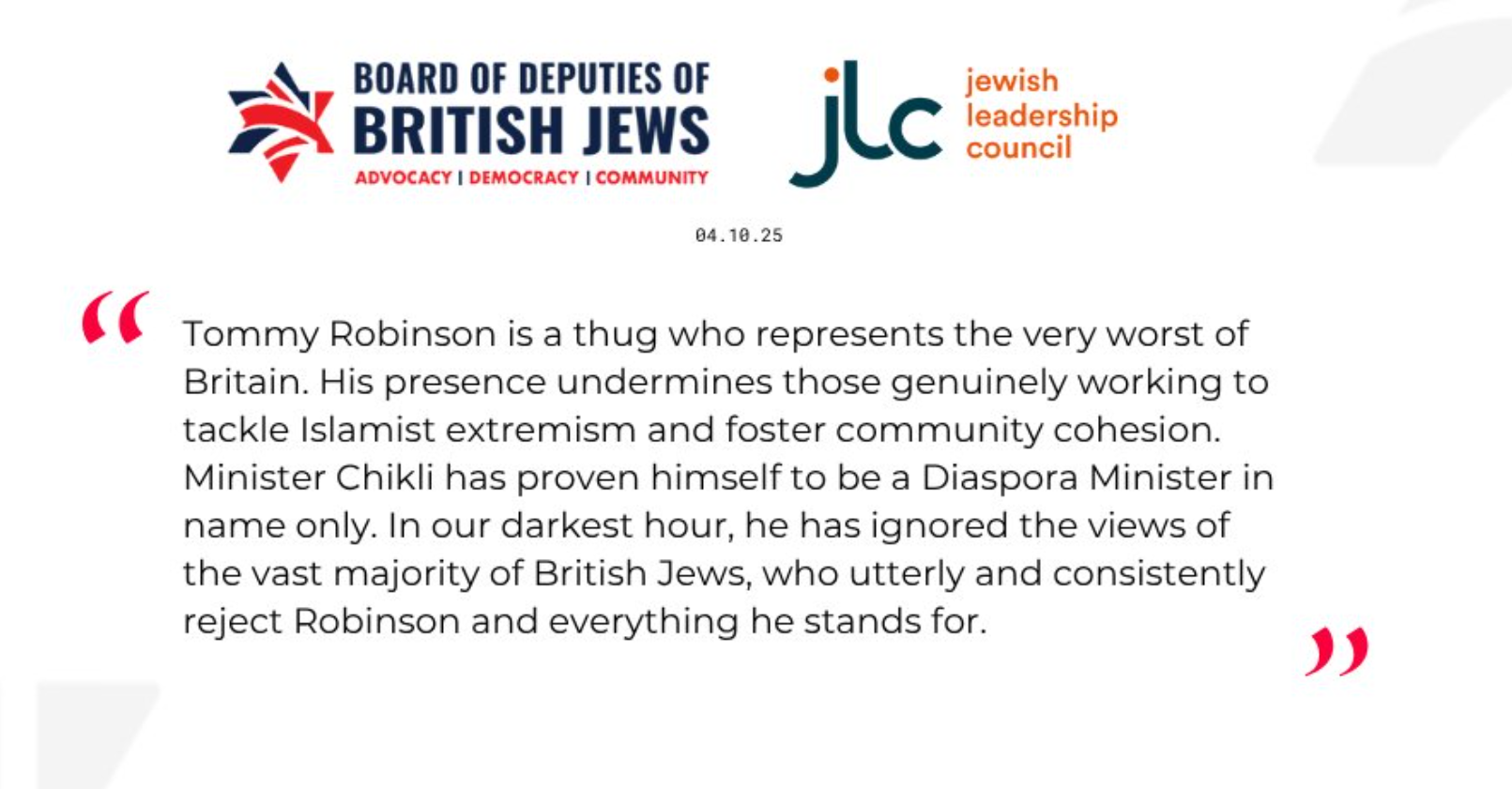 “Minister Chikli has proven himself to be a Diaspora Minister in name only. In our darkest hour, he has ignored the views of the vast majority of British Jews, who utterly and consistently reject Robinson and everything he stands for.”